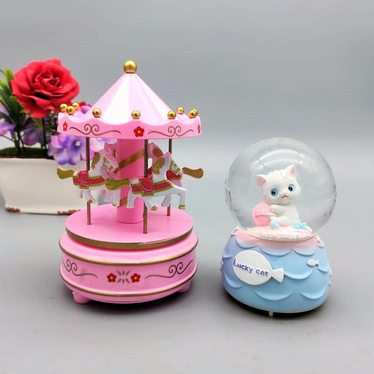 Cute Cat Lighted Musical Medium Size Snow Globe And Carousel Music Box Gift Set