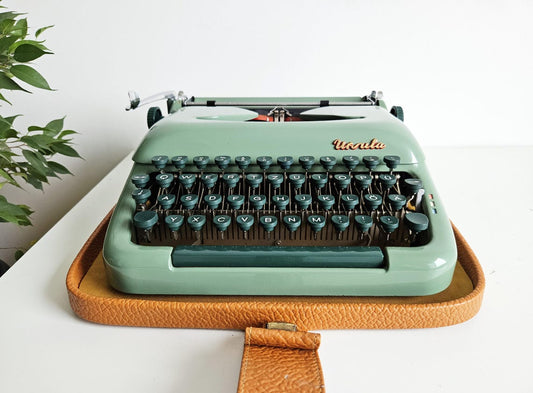 Green Ursula portable working vintage typewriter from the 1950s. With case, unusual gift