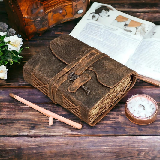 Vintage leather Journal with Key - Blank Spell Book of Shadows, Grimoire Journal, Travel Writing Notebook, Antique Deckle Edge Paper