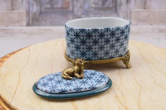 Antique Blue Porcelain Casket with Bronze Ornaments - Porcelain Box with Lid on Bronze Base - Cat-shaped Handle - Home Decor - Gift Idea