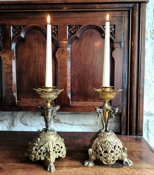 Glorious pair of rare, antique, French, handmade, cast bronze, Ecclesiastical, altar candlesticks. Circa late 1800's / early 1900's